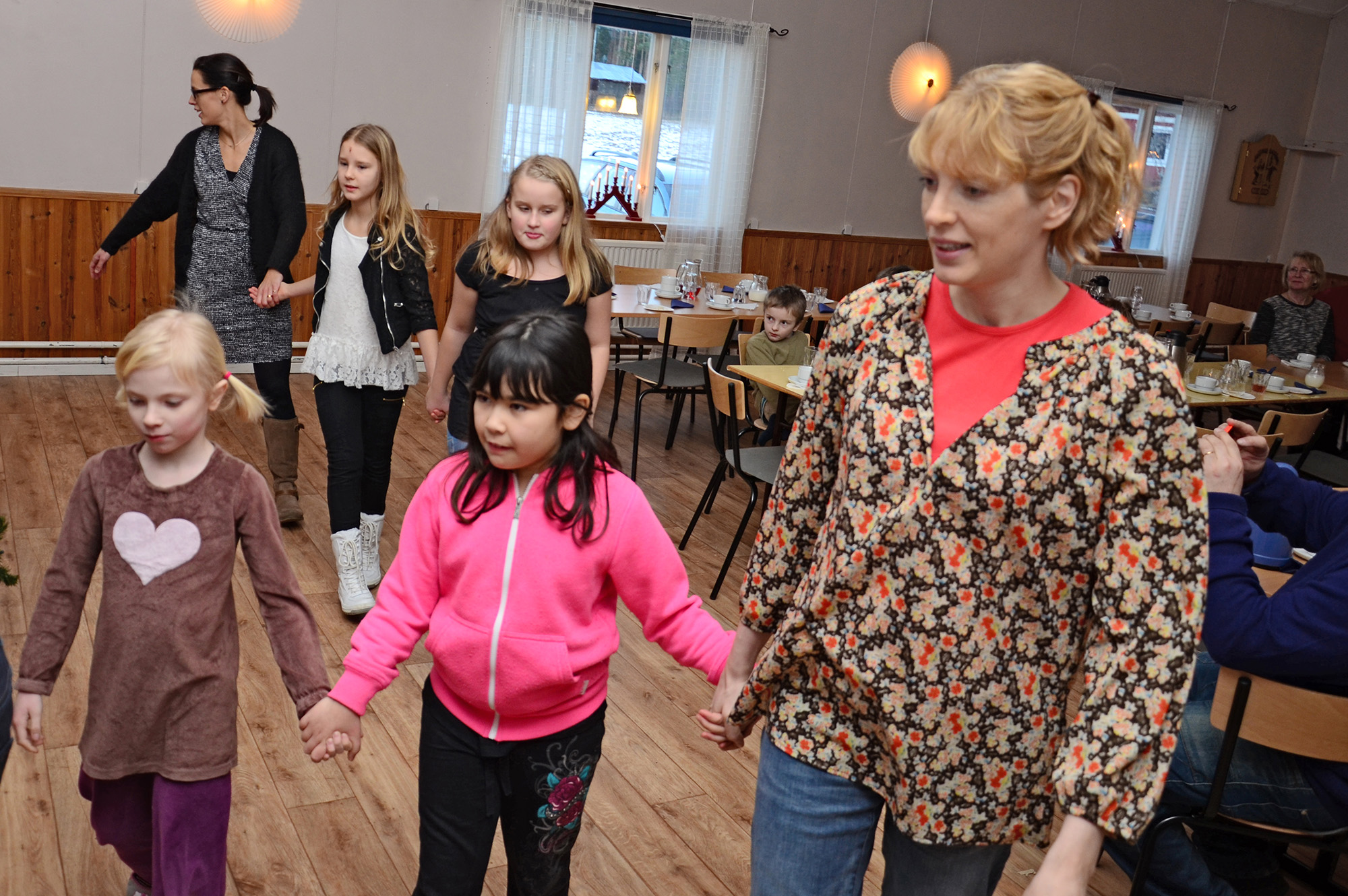 TRE SMÅ GUMMOR. Bodil Åsberg tillsammans med kompisen Nina Larsson och mamma Katarina i dansleken Tre små gummor. Bakom dem Johanna Björklund Hansson, Maja Lindberg och Emma Frost.