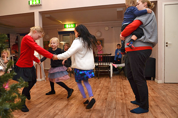 Jill Åsberg, närmast granen, tar en svängom tillsammans med systern Bodil och Maja Stigsvala.