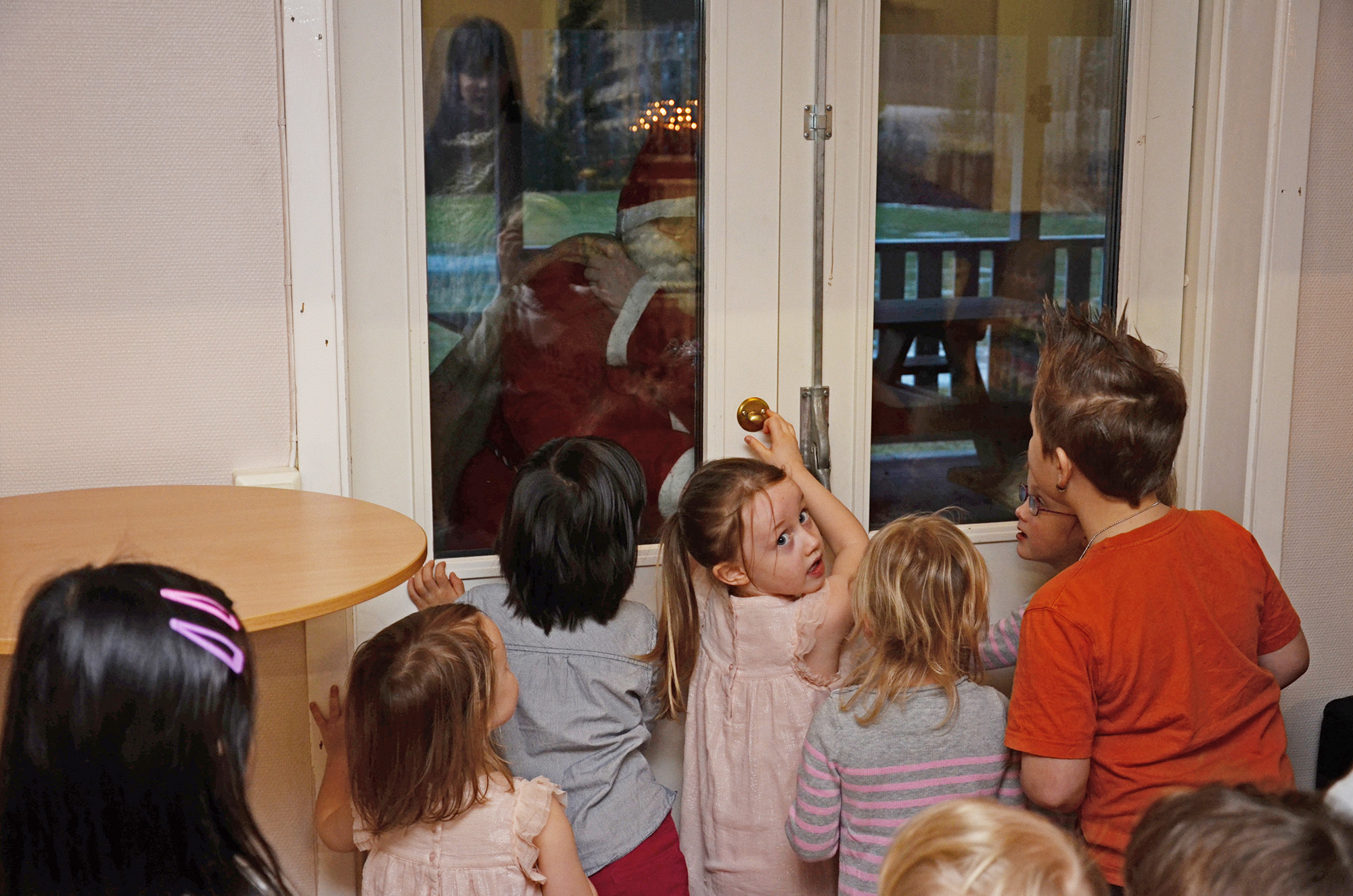 Flera av barnen försöker öppna dörren och hjälpa tomten att komma in.