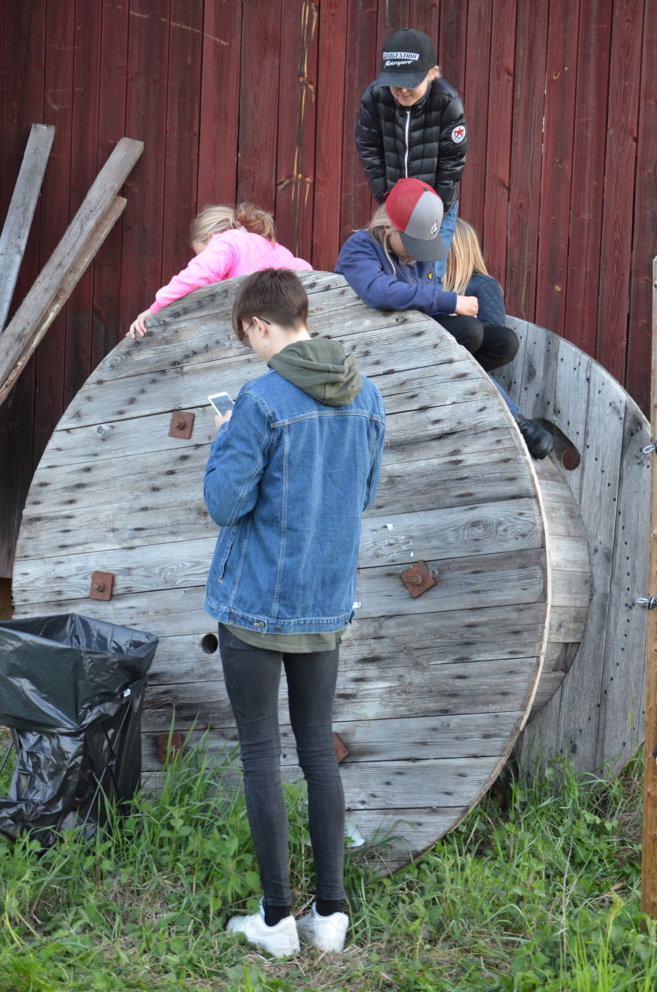 Röstebilder 2019 – Logdans i FarmorsladanFoto: Pär Nordqvist, 2019. Kamera: Nikon D7000. NÖJE FÖR DE UNGA. Kevin Karlsson kollar sin mobilstatus medan de lite yngre klättrar och klänger på kabeltrumman.