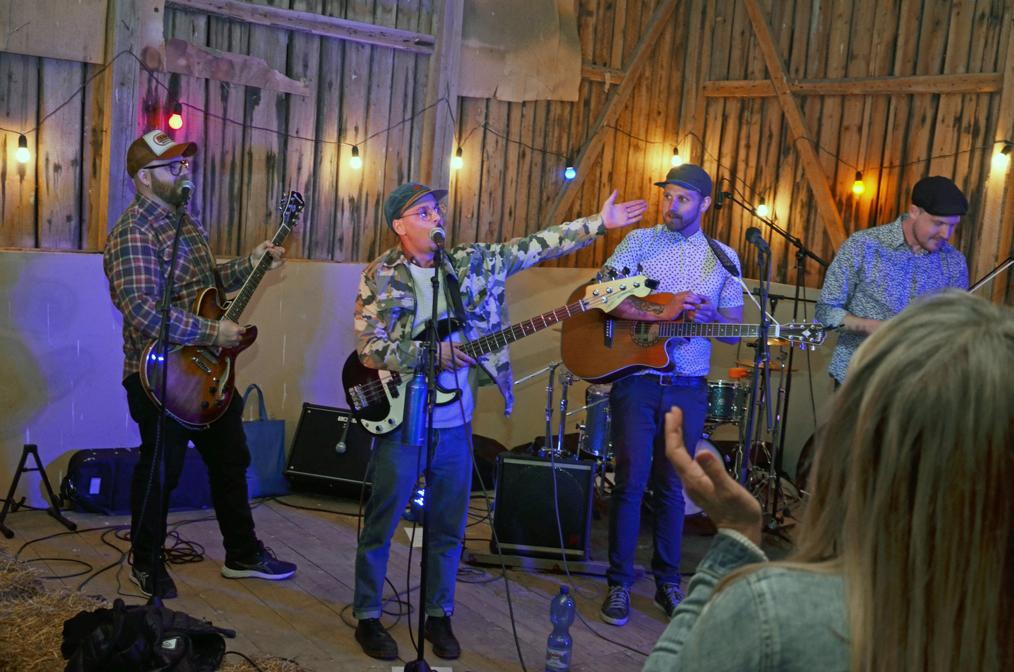 Röstebilder 2019 – Logdans i Farmorsladan Foto: Pär Nordqvist, 2019. Kamera: Nikon D7000. DE TACKAR FÖR I KVÄLL. Pelle Med Två:s spelning är över. Musikerna tackar publiken och presenterar sig själva.