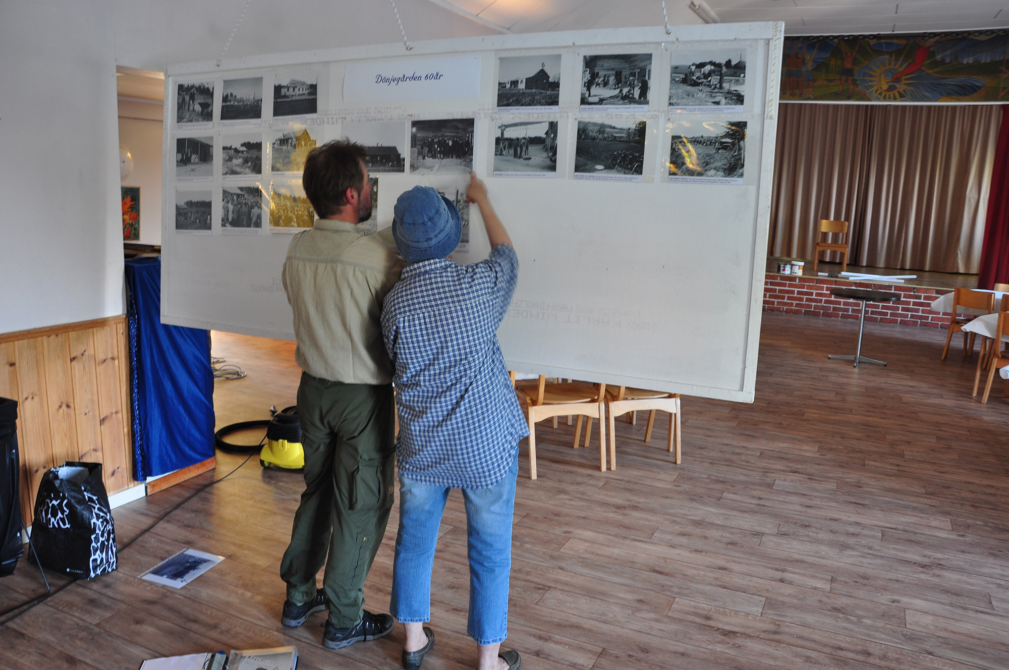 Henrik Lang och Anita Sundström hänger upp bilder från Dönjegårdens historia inför jubiléet.
