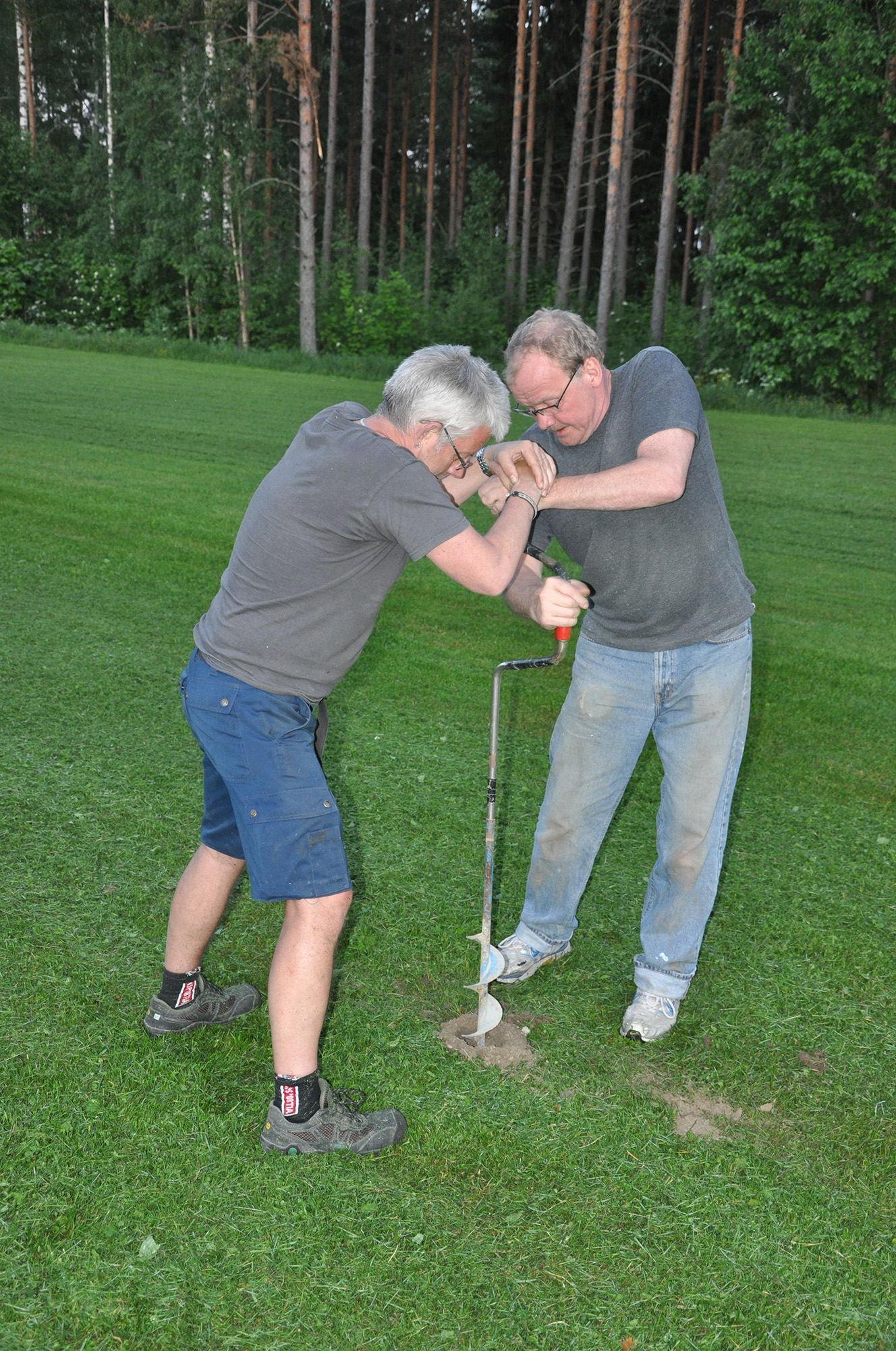 Foto: Pär Nordqvist, 2012. Kamera: Nikon D90.ISBORR MITT I SOMMAREN 1. En isborr kan användas till mycket, bland annat att borra hål för en midsommarstång. Borrar gör Bengt Tegnér och Stefan Bengtsson. | |