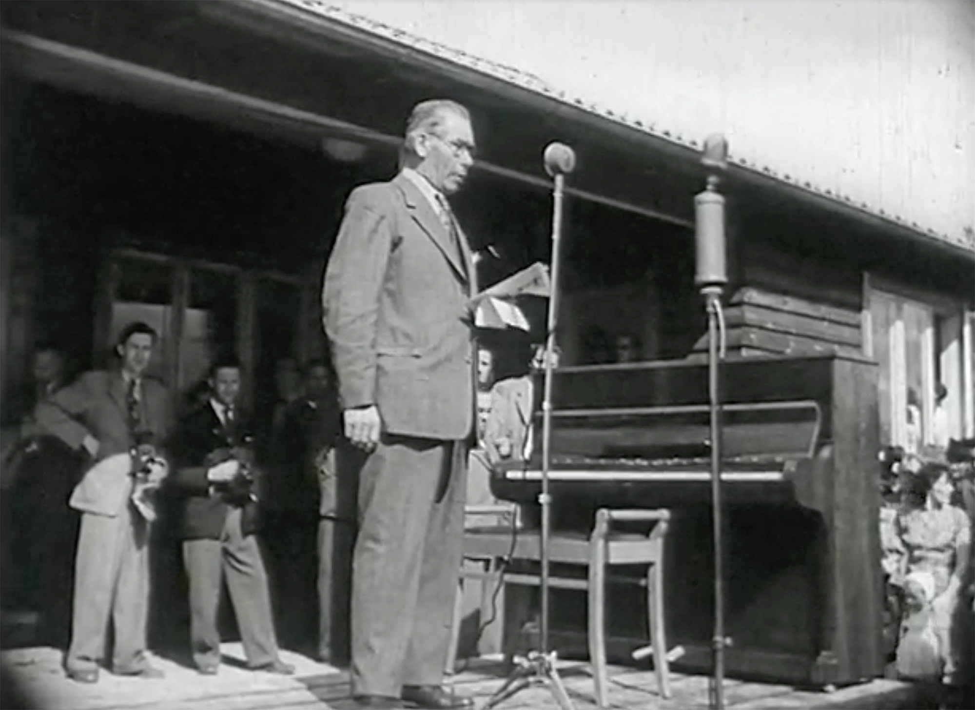 ![]() Röstebilder 2012 – Midsommarfirande och Dönjegårdens 60-årsjubileum ![]() Foto: Skärmdump från filmen ’’Midsommar med Snoddas’’ från 1952. INVIGNINGSTALARE. Landstingsman Albert W. Sjöberg håller tal och förklarar Dönjegården invigd den 22 juni 1952. Omkring 10 000 lyssnar på honom. | |