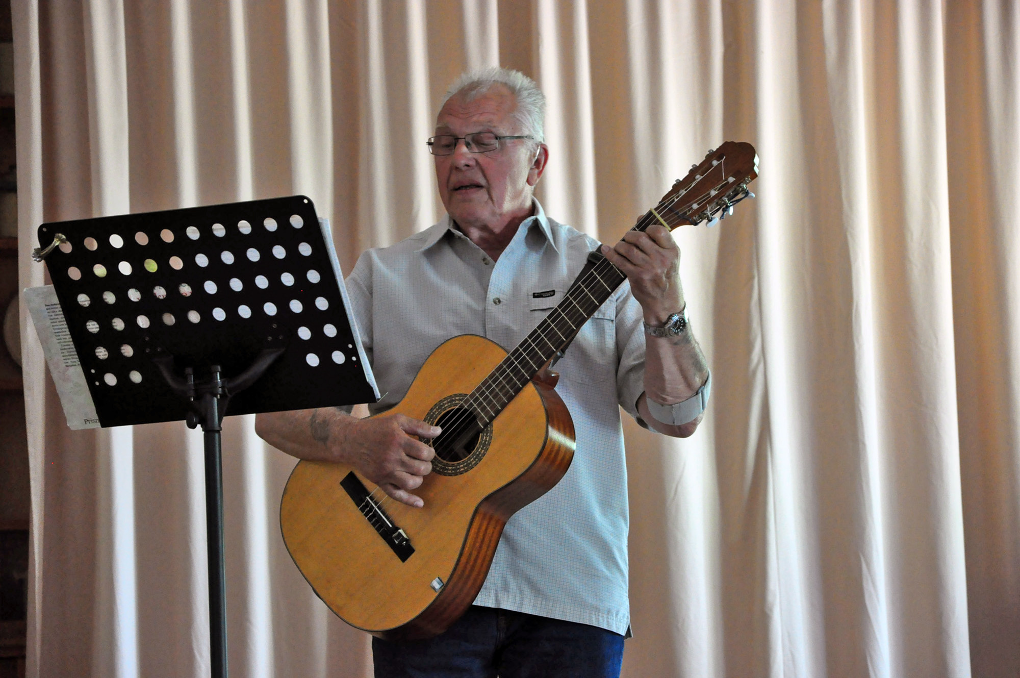 ![]() Röstebilder 2012 – Midsommarfirande och Dönjegårdens 60-årsjubileum ![]() Foto: Pär Nordqvist, 2012. Kamera: Nikon D90. ÅTERVÄNDANDE SPELMAN. Leif Johnsson underhåller med musik av Snoddas och Dan Andersson. Han kommer ursprungligen från Åsbacka och har efter ett långt liv i Stockholm återvänt till Bollnäs. | |