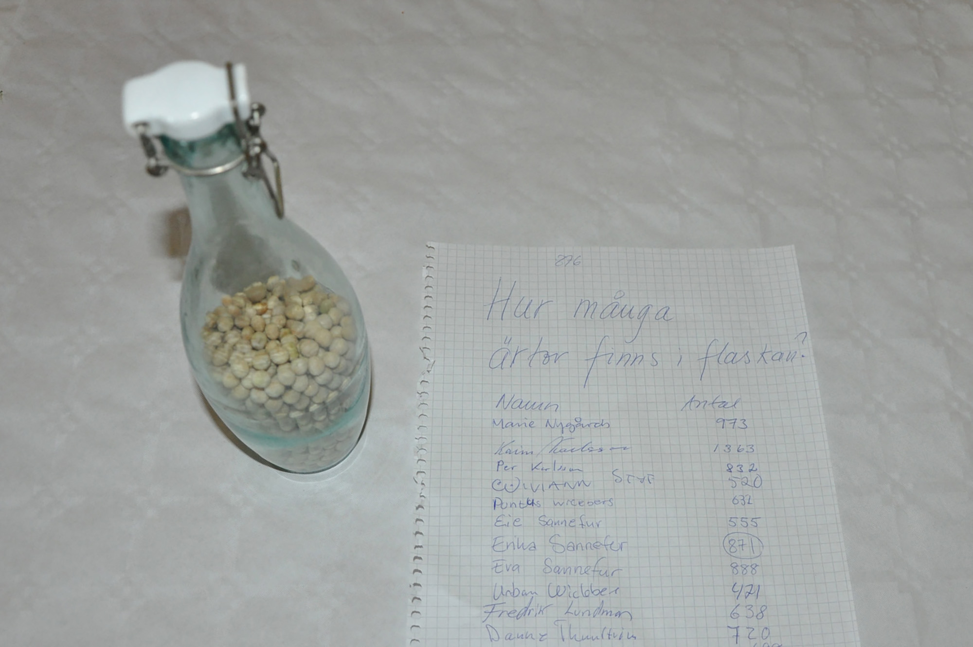 antalet ärtor i flaskan. Den innehöll 876 st.