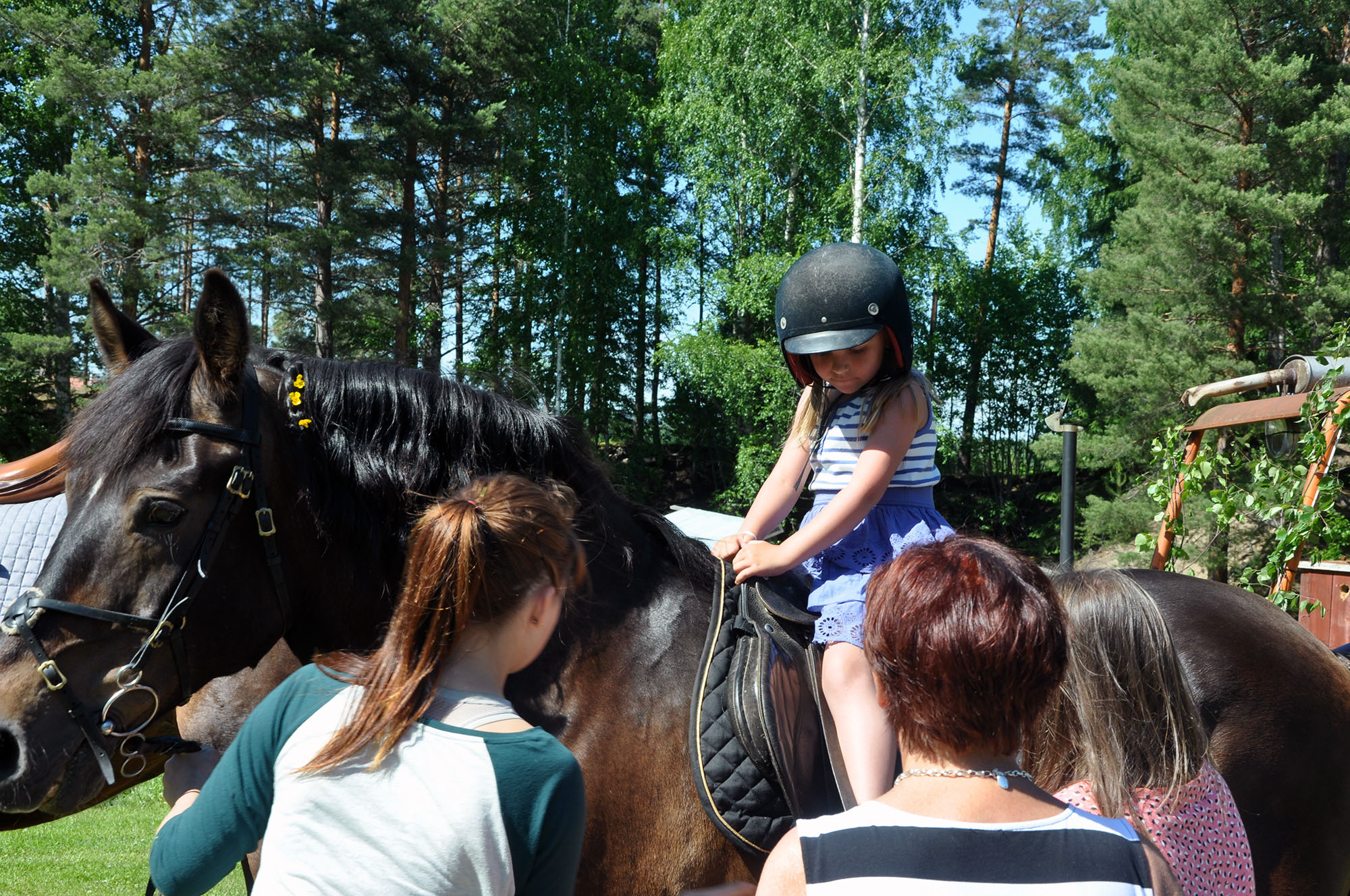 Röstebilder 2013 – Midsommarfirande vid Dönjegården Foto: Pär Nordqvist LOCKANDE HÄSTAR. Solveig Bolinders barnbarn Molly sitter nu på hästryggen. Solveig är kvinnan i randigt med ryggen åt kameran.