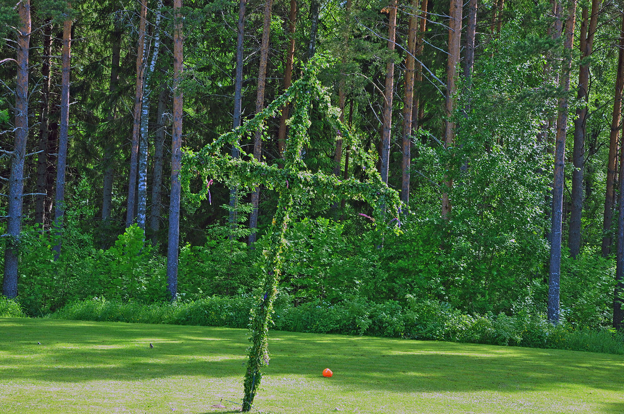 Röstebilder 2013 – Midsommarfirande vid Dönjegården Foto: Pär Nordqvist LUTANDE STÅNGEN I RÖSTE. Midsommarstången har börjat luta betänkligt efter dansen. Påminner lite om ett visst torn i Pisa.
