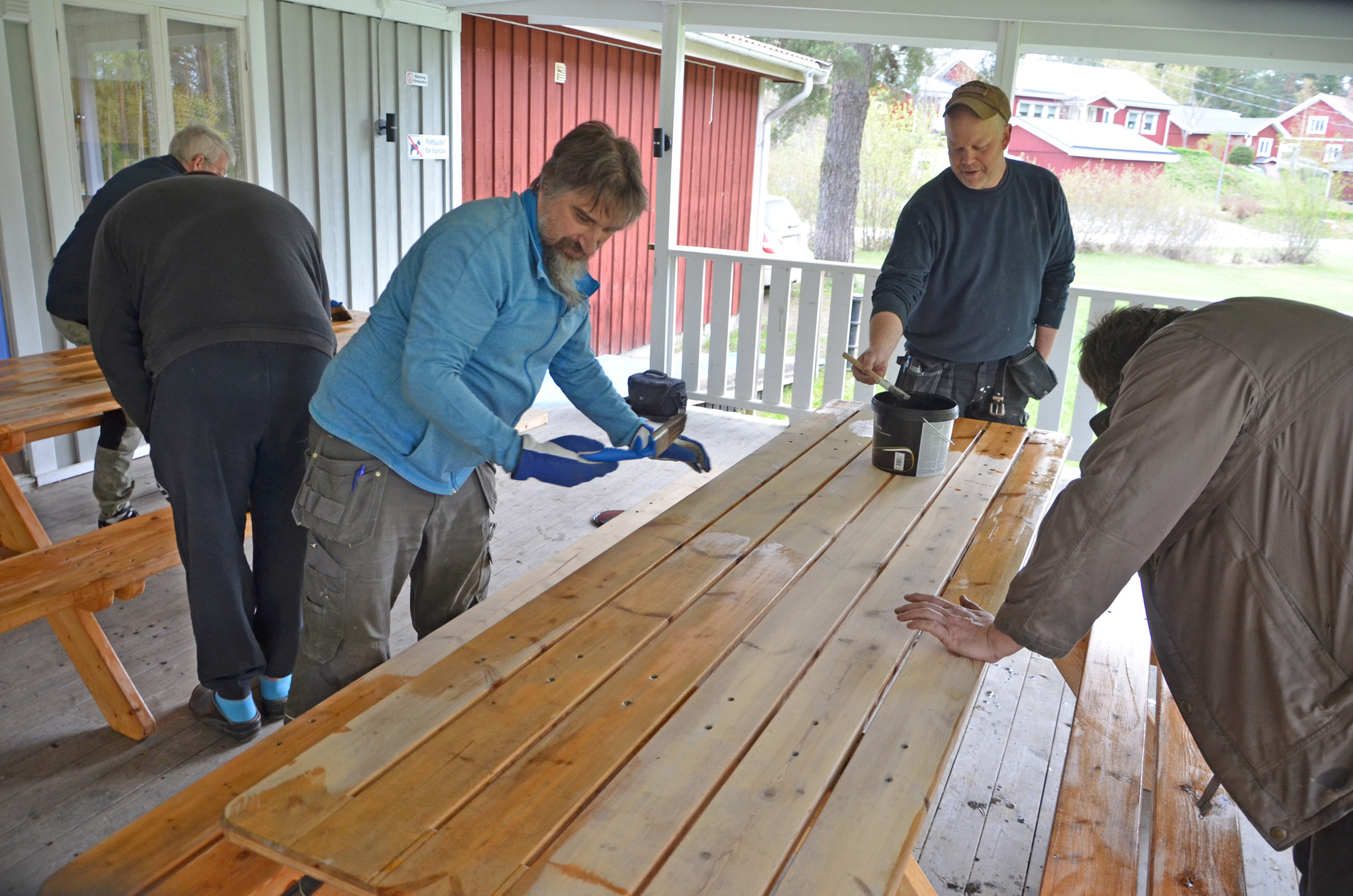 INOLJNING AV BÄNKBORD PÅ DÖNJEGÅRDEN 11 MAJ 2019. Tomas Frisk, Göran Andersson och Henrik Olofsson.