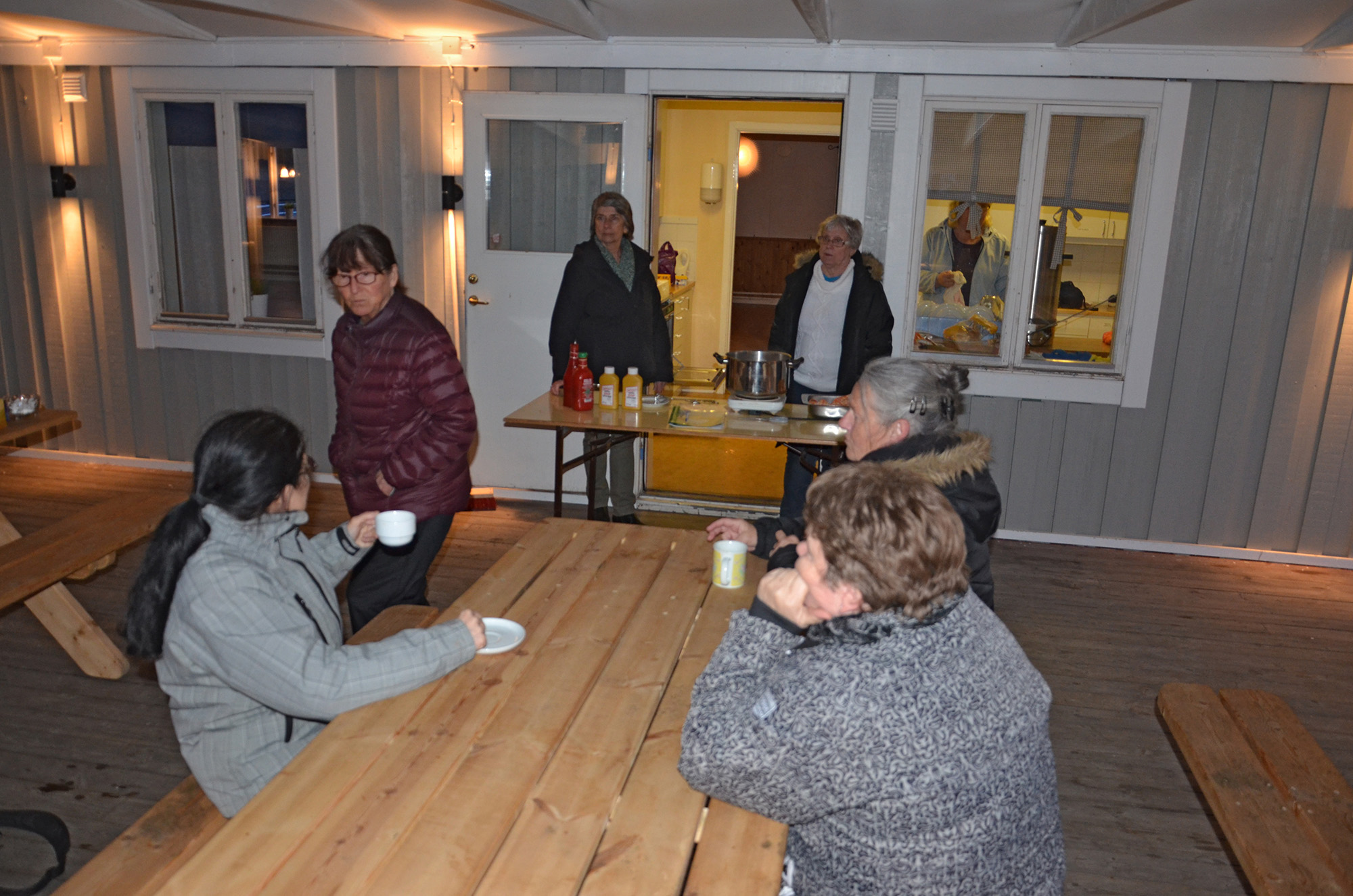 KORV OCH FIKA. Det såldes varmkorv på altanen, men även vanligt kaffebröd och kaffe, så klart. I mörkröd jacka Monica Ekström, Britt-Marie Dahlin och Karin Tällberg med systern Inger.