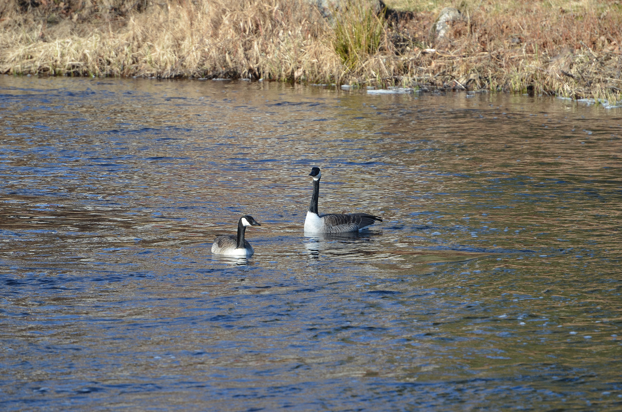 ![]() Foto: Pär Nordqvist, 2020. Kamera: Nikon D7000. Kanadagäss i Galvån RÖSTE 21 mars 2020 På lördagsmorgonen hade två kanadagäss tagit en paus i Galvån i närheten av Röste badhus. De simmade omkring en stund innan de blixtsnabbt flög iväg under sedvanligt kluckande. ![]() GÄSS-SNACK. De båda gässen pratar med varandra, eller gör något helt annat. ![]() TAR TILL FLYKTEN. Plötsligt lyfter gässen från vattnet och sticker iväg. Det gårr blixtsnabbt, man hinner knappt med att fota. ![]() KANADAGÄS FLYGER ÖVER RÖSTE, 21 mars 2020.