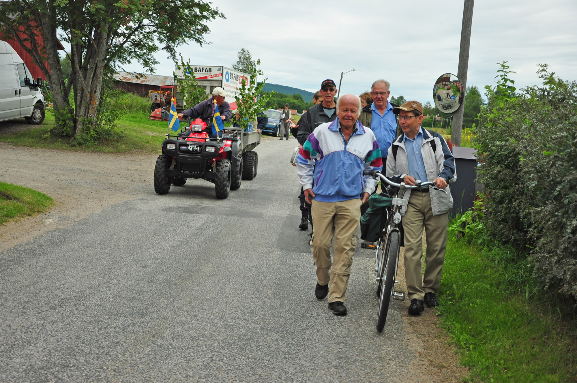 ![]() Röstebilder 2012 – Byvandring från Dönje kraftverk till Per-Ers udde ![]() Foto: Pär Nordqvist, 2012. VID RÖSTBERGS. Einar Zetterlund och Göran Gustafsson passerar Röstbergs på båda sidor av vägen. Till vänster kommer skjutsen av de lite äldre. Åke Lindberg kör. | |