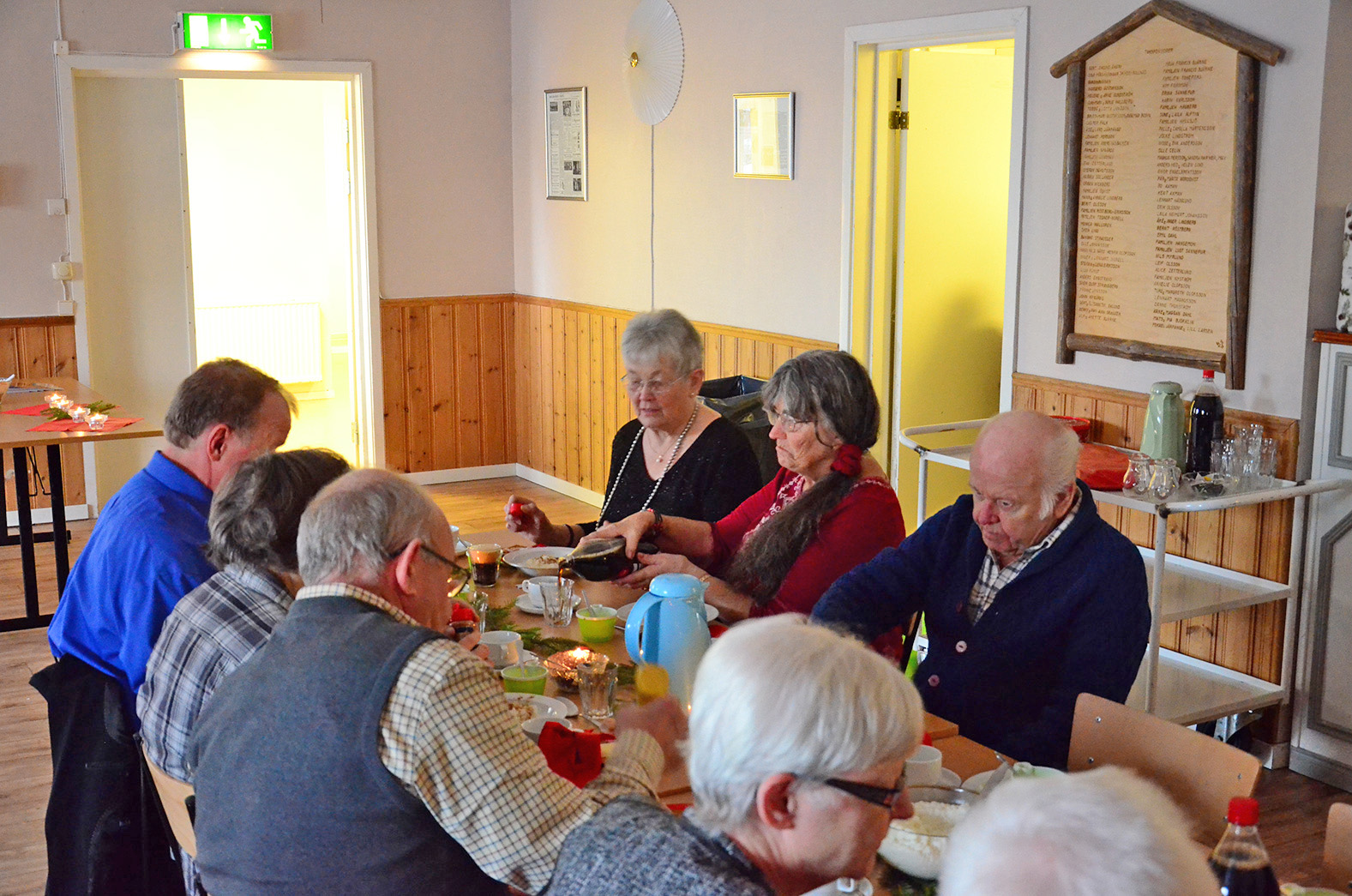 Röstebilder 2015 – Grötfest med luciafirande i Dönjegården Foto: Pär Nordqvist GRÖTFEST 2015. Inger Norell, Alice Zetterlund, Einar Zetterlund och snett mittemot Stefan Bengtsson i blå skjorta, Anna-Britta Pettersson med flera.