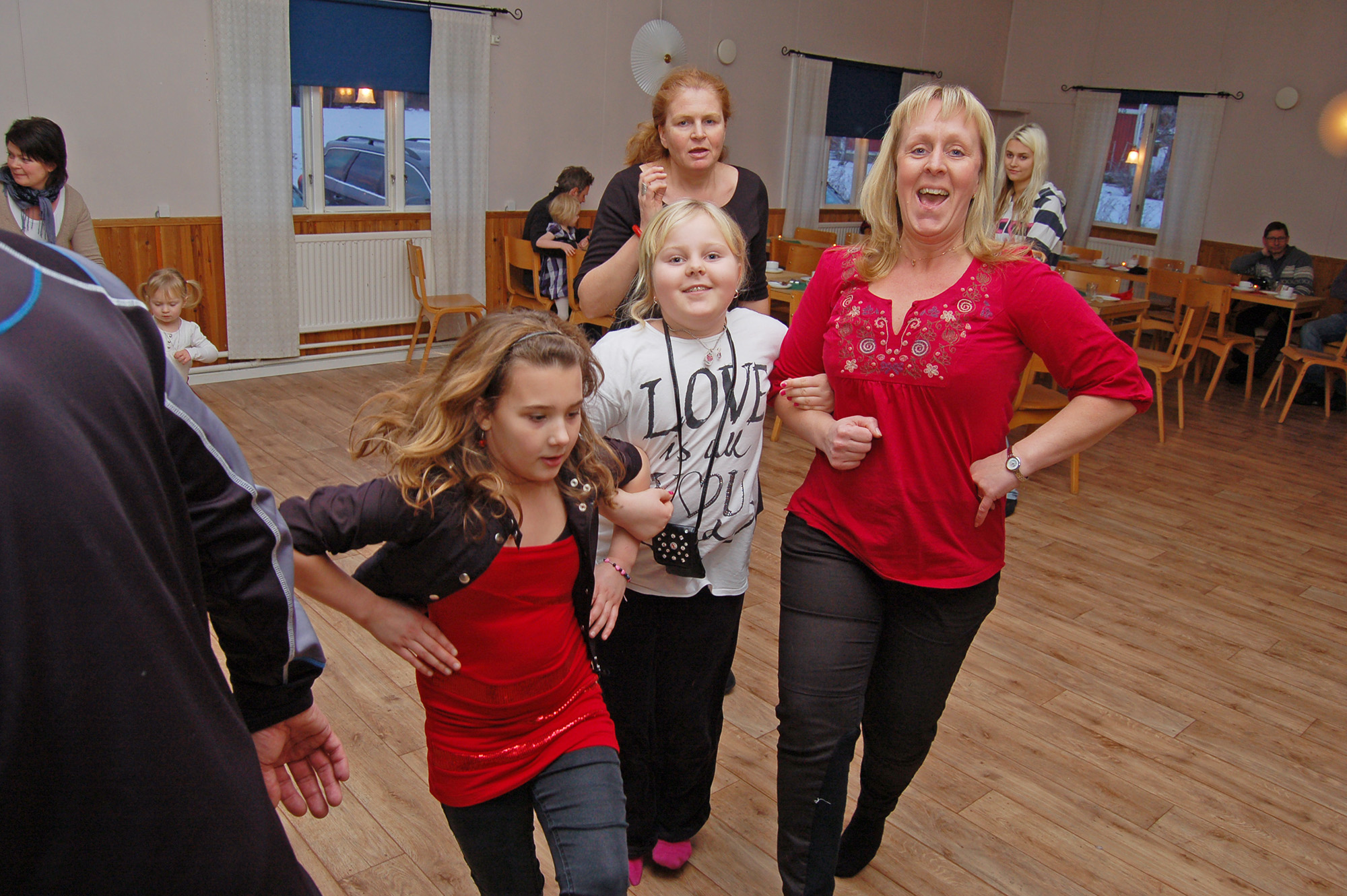 Kristina Lundman visar sann dansglädje tillsammans med dottern Elin och Jonna Nord. I bakgrunden Maria Stigsvala.