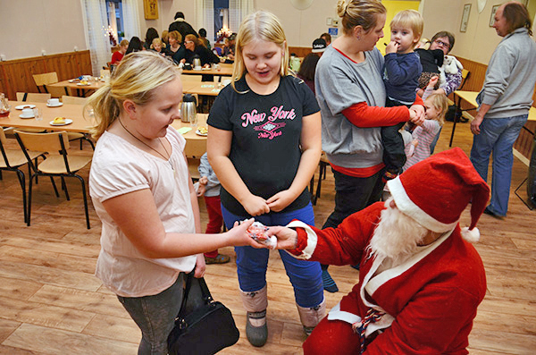 Röstebilder 2014 – Julgransplundring i Dönjegården Foto: Pär Nordqvist ELIN OCH JULIA HOS TOMTEN. Elin Lundman och Julia Andréasson står på tur. Det är Elin som i detta ögonblick får godispåse.