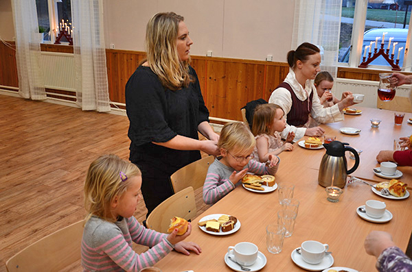 Lena Ahlgren och Pernilla ser till sina döttrar, som smaskar i sig bullar och saft.