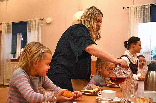 Lena Ahlgren fyller på av den röda söta drycken.