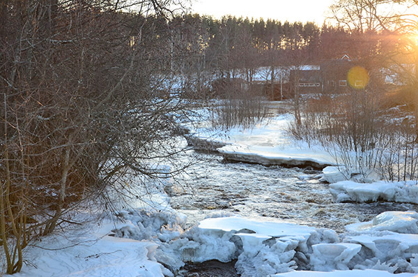 Kylan, som kommit och gått under vintern, har bildat is i Galvån.