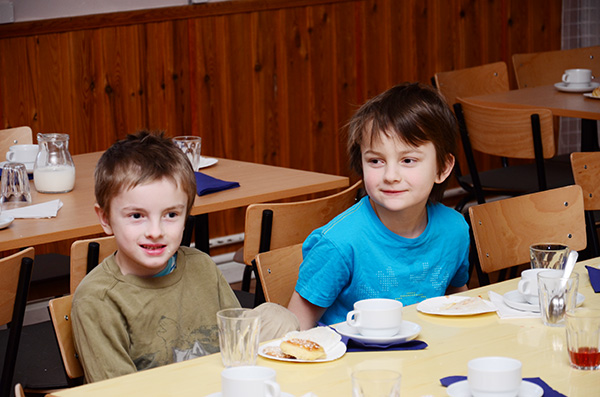 Nils Sköld och Axel Mårtensson vid fikabordet.
