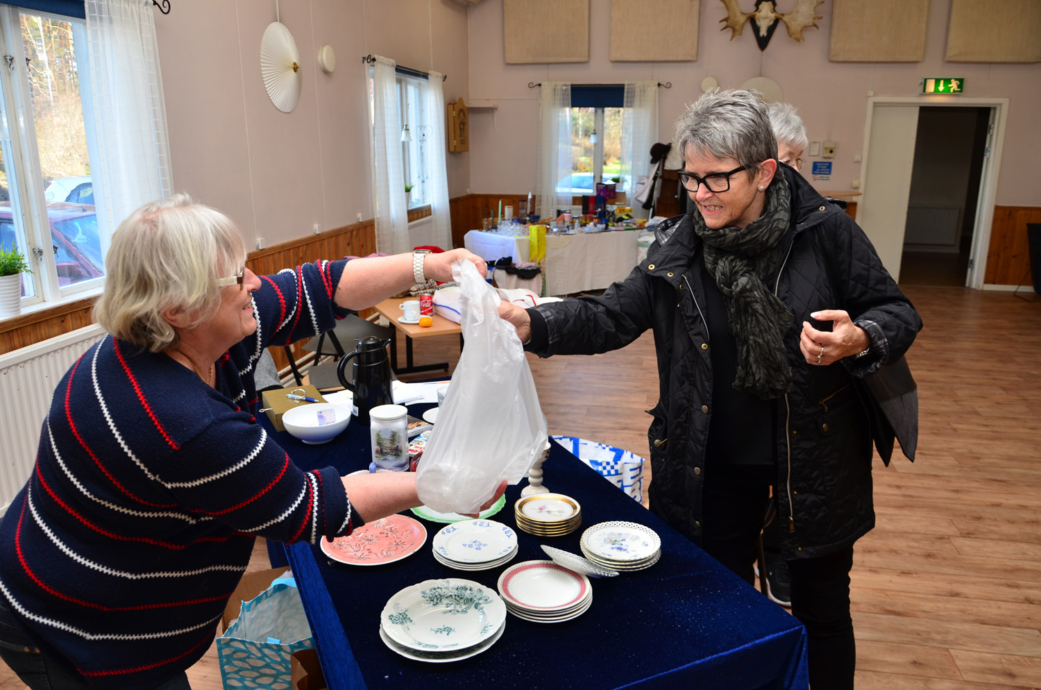 Anette Falk får sin nyinköpta ljusstake med sig hem. Åse Järpenge ombesörjer transporten.
