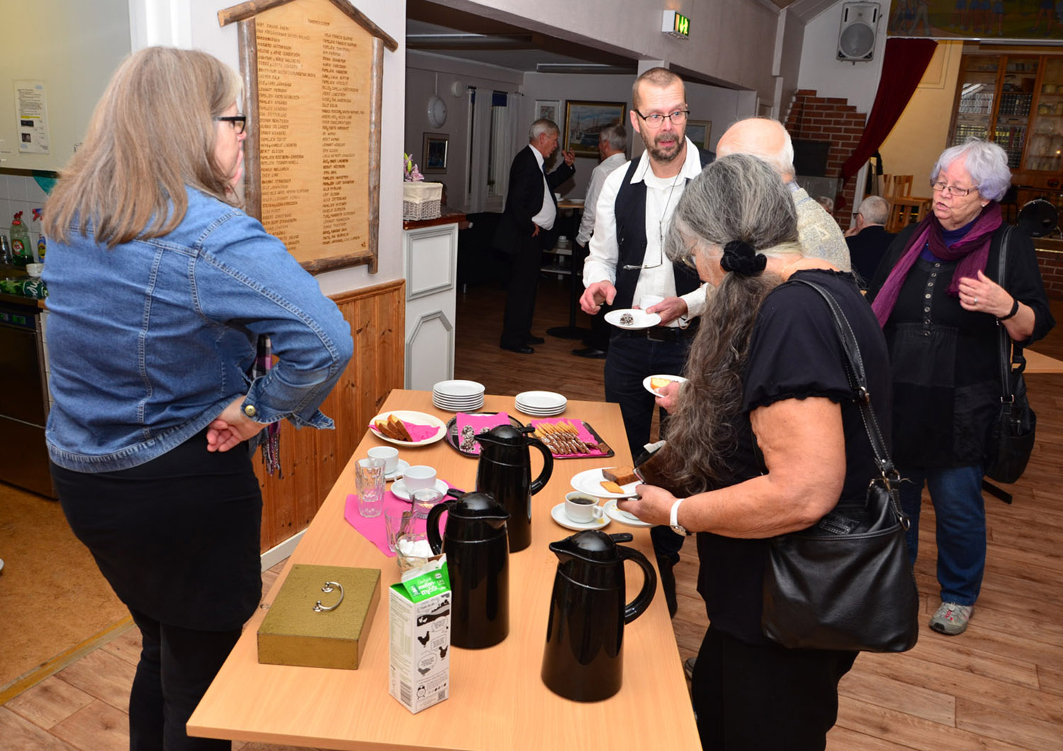 Det blev kaffe i pausen. Anita Bodin pratar med gästerna. Närmast kameran Alice Zetterlund och maken Einar. Hans Lindberg längst ner.