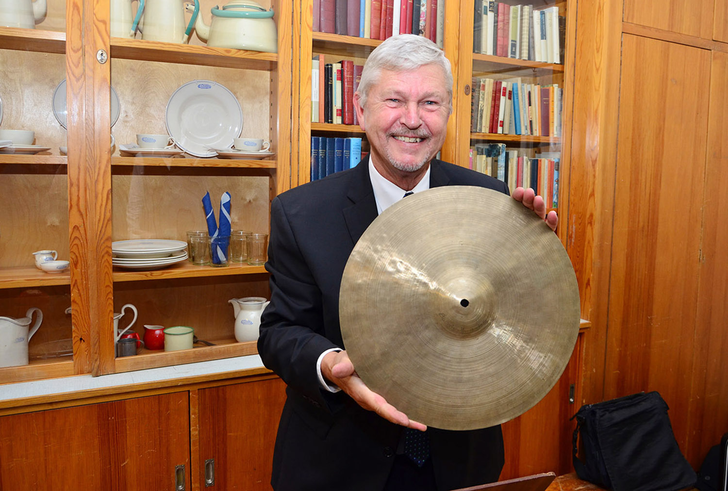 CYMBAL MED PROVENIENS. Pelle Saur håller upp den cymbal som deltog vid invigningen av Dönjegården 1952 och som ingick i Järnvägsmännens musikkår.