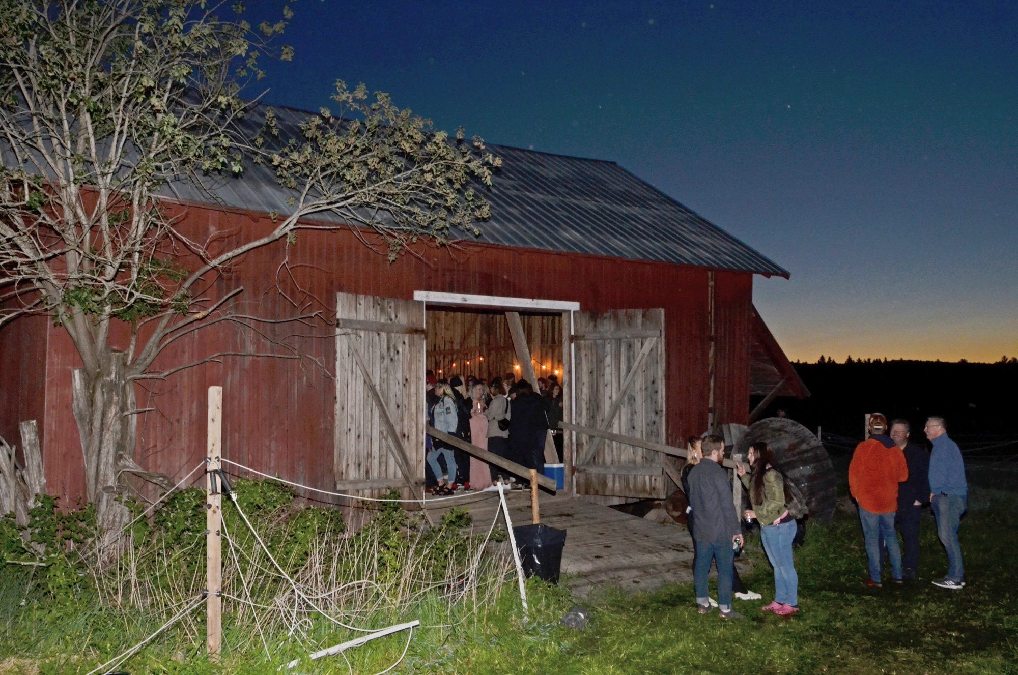 Röstebilder 2019 – Logdans i Farmorsladan Foto: Pär Nordqvist, 2019. Kamera: Nikon D7000. LOGDANSLADA I SKYMNING. Pelle Med Två har avslutat sin spelning, nu ljuder inspelad musik i högtalarna. Skymningen faller.