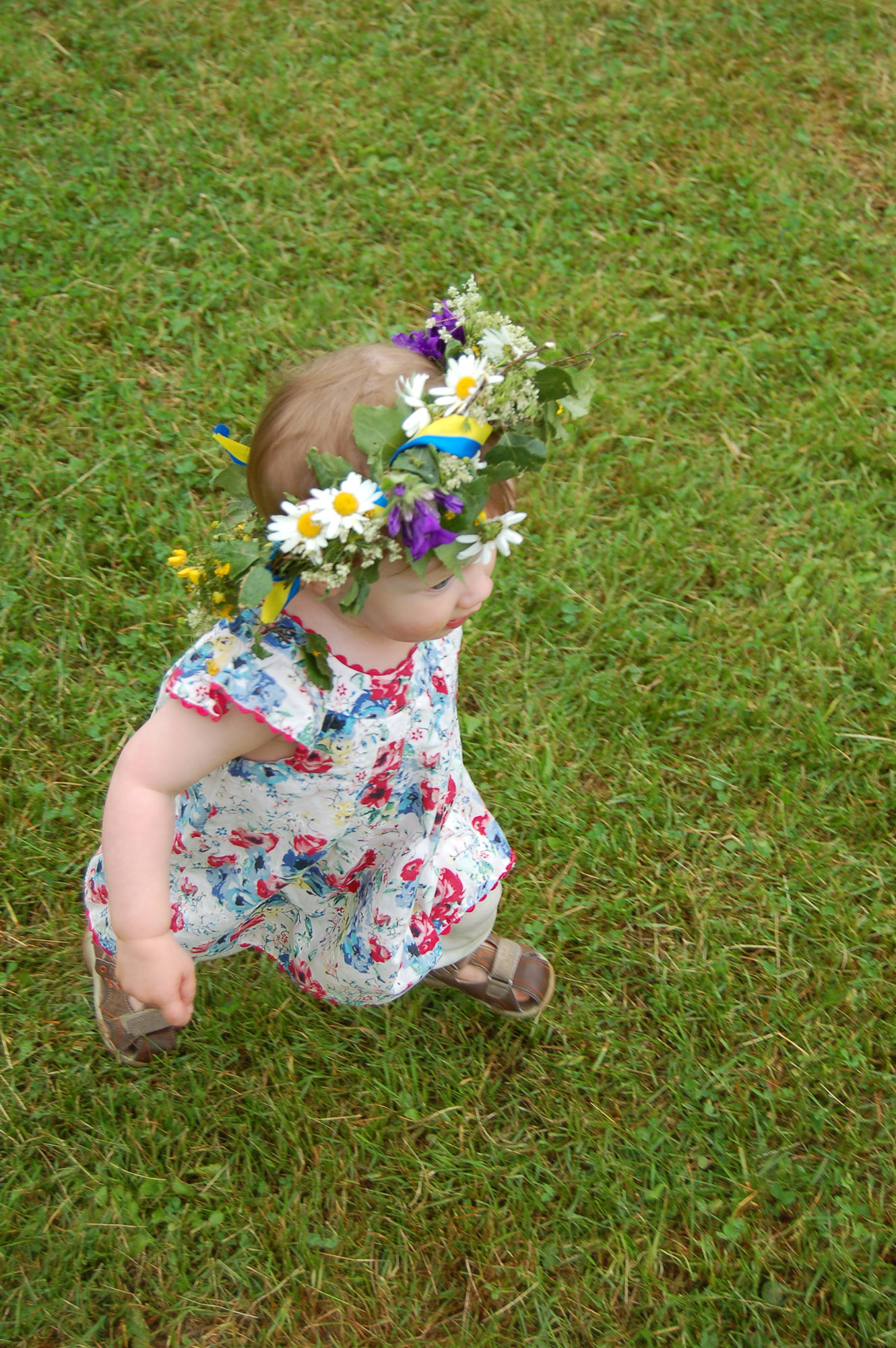 Liten flicka med krans i håret har bråttom framåt i gräset.