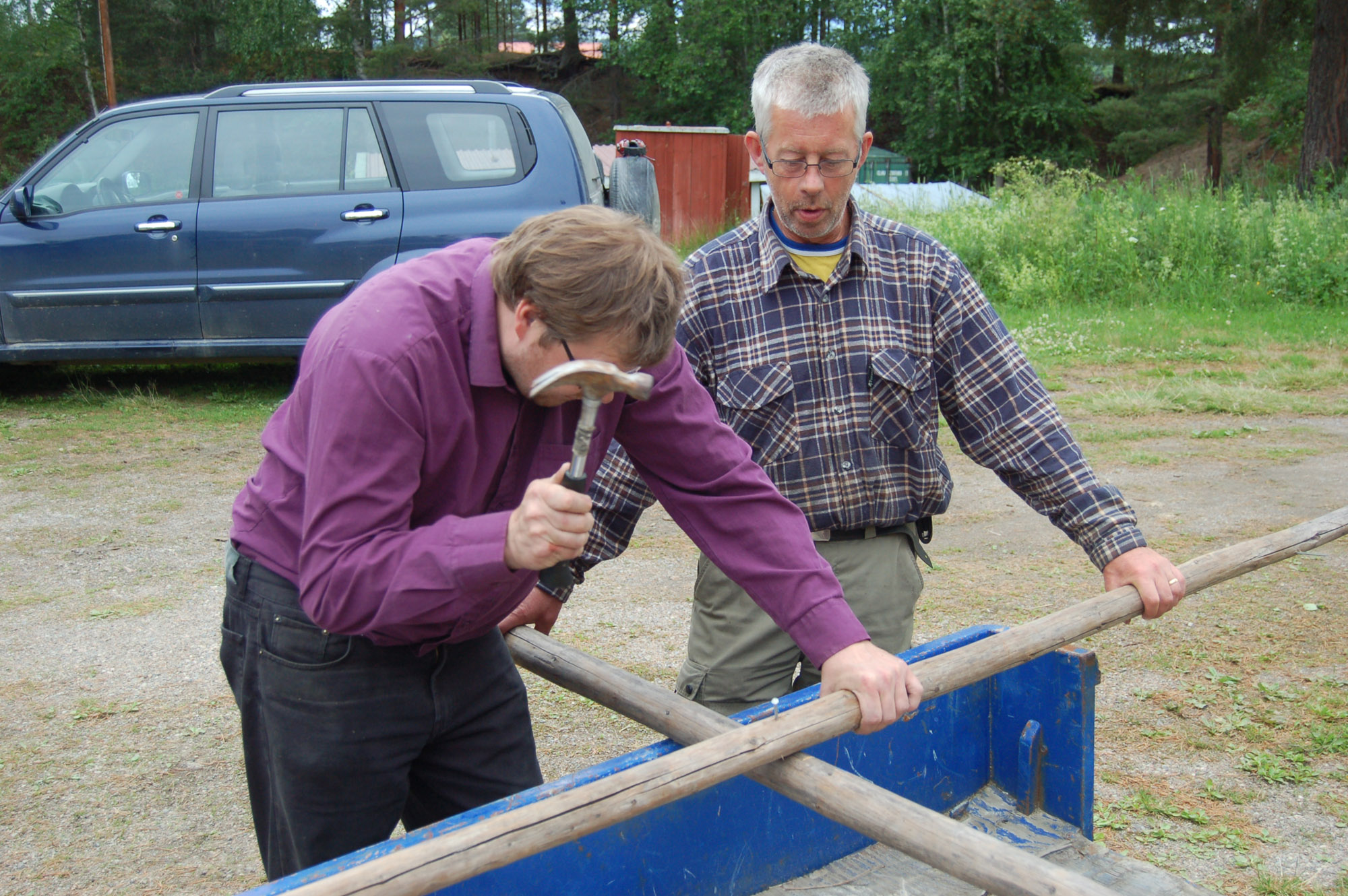 Röstebilder 2011 – Inför midsommarfirandet på Dönjegården Foto: Pär Nordqvist SE UPP FÖR TUMMEN! Henrik Olofsson snickrar ihop stommen till årets midsommarstång. Det gäller att inte slå sig på tummen bara. Bengt Tegnér håller ställningen.