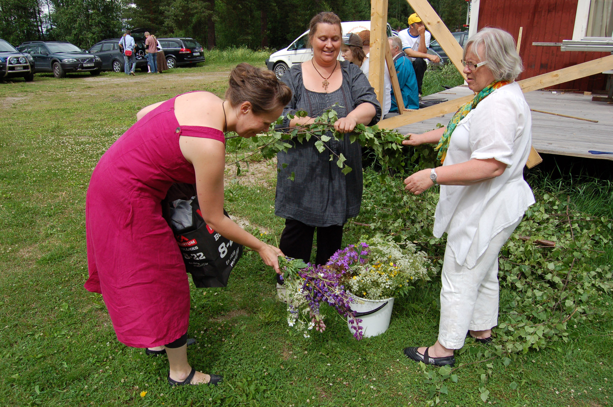 Helena Frisk och Åse Järpenge gör ringarna till midsommarstången. Sofia Leijnegard hjälper till.