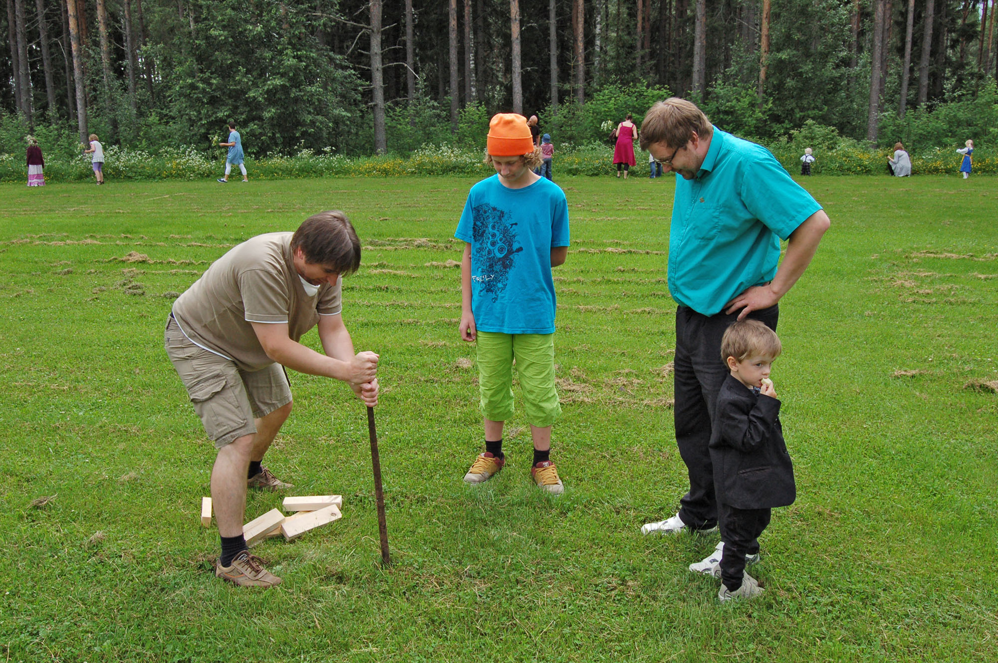 Röstebilder 2011 – Många firade midsommar i Röste Foto: Pär Nordqvist MYCKET PÅ ETT SPETT. Tomas Frisk gör ett hål i gräsmattan att fästa stången i. Åskådare är Elis Mårtensson, Henrik Olofsson och Nils Sköld.