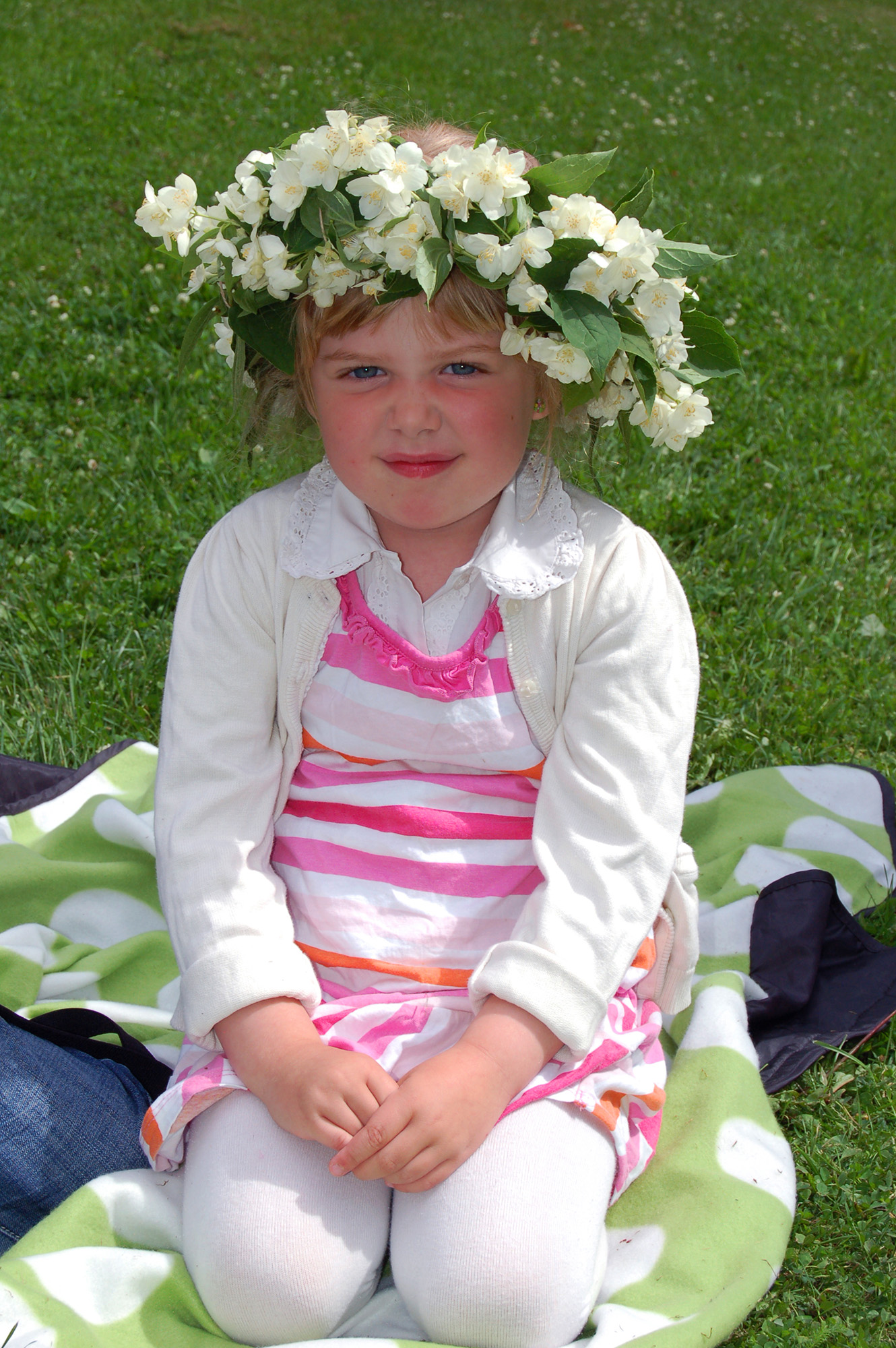 Vilma Vestersund har sina finaste kläder på och en fantastisk krans.