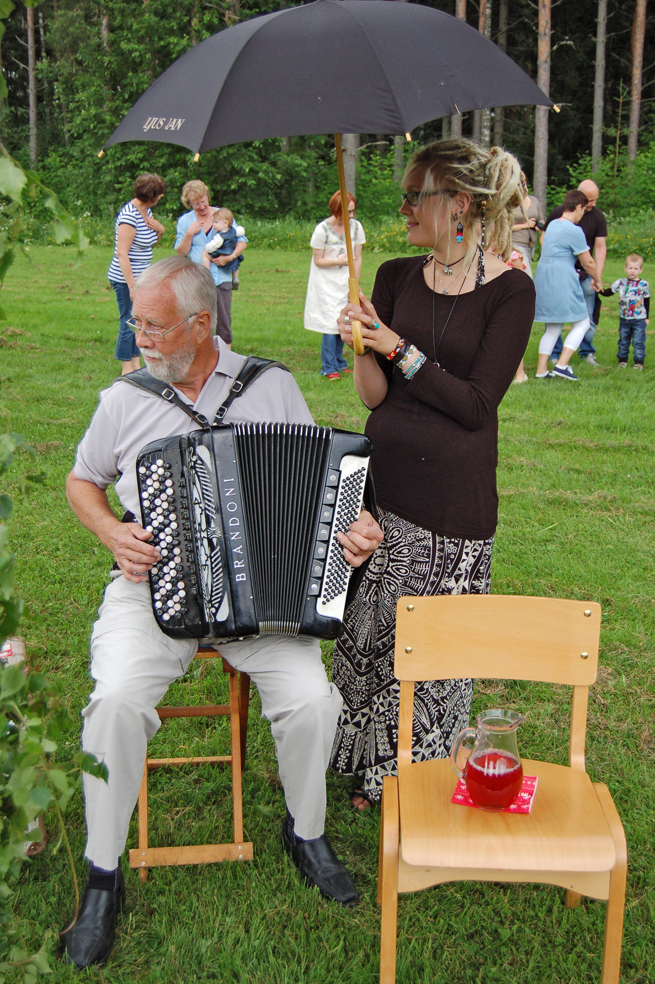 Sven-Olof Bohlins får hjälp att komma undan regnet av Malin von Schoting som håller i paraplyet.