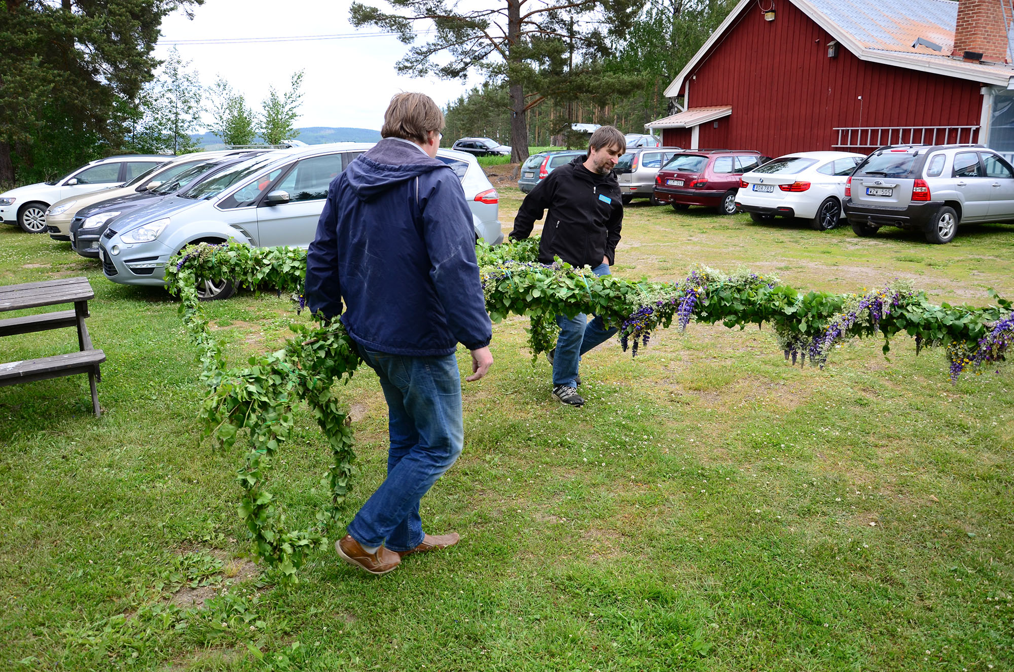 Henrik Olofsson och Tomas Frisk bär fram midsommarstången för resning.
