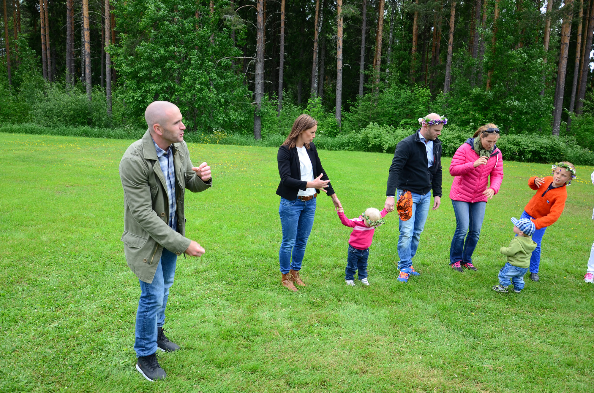 Röstebilder 2014 – Midsommarfirande vid Dönjegården Foto: Pär Nordqvist ’’VI KAN SPELA FIOLIOLEJ...’’ Anders Sundström med flickvännen Johanna, en liten knodd, Johan Sundström med flera spelar luftinstrument.
