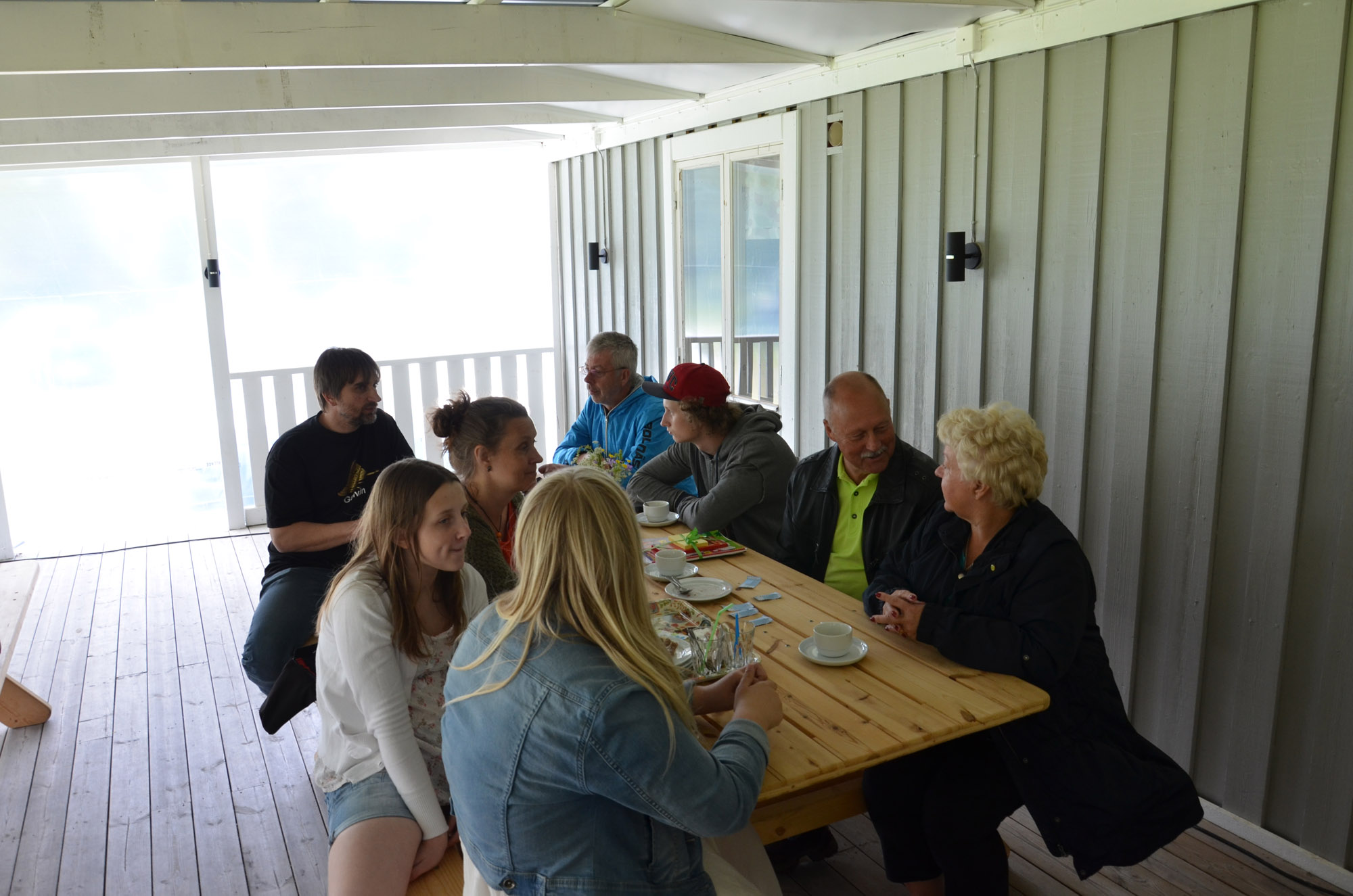 Röstebilder 2014 – Midsommarfirande vid Dönjegården Foto: Pär Nordqvist VID ETT AV (KAFFE)BORDEN satt Bengt Tegnér, Elis Mårtensson, Lasse Andersson med hustrun Anna, Tomas Frisk med hustrun Helena och dottern Malva samt Julia Andréasson.