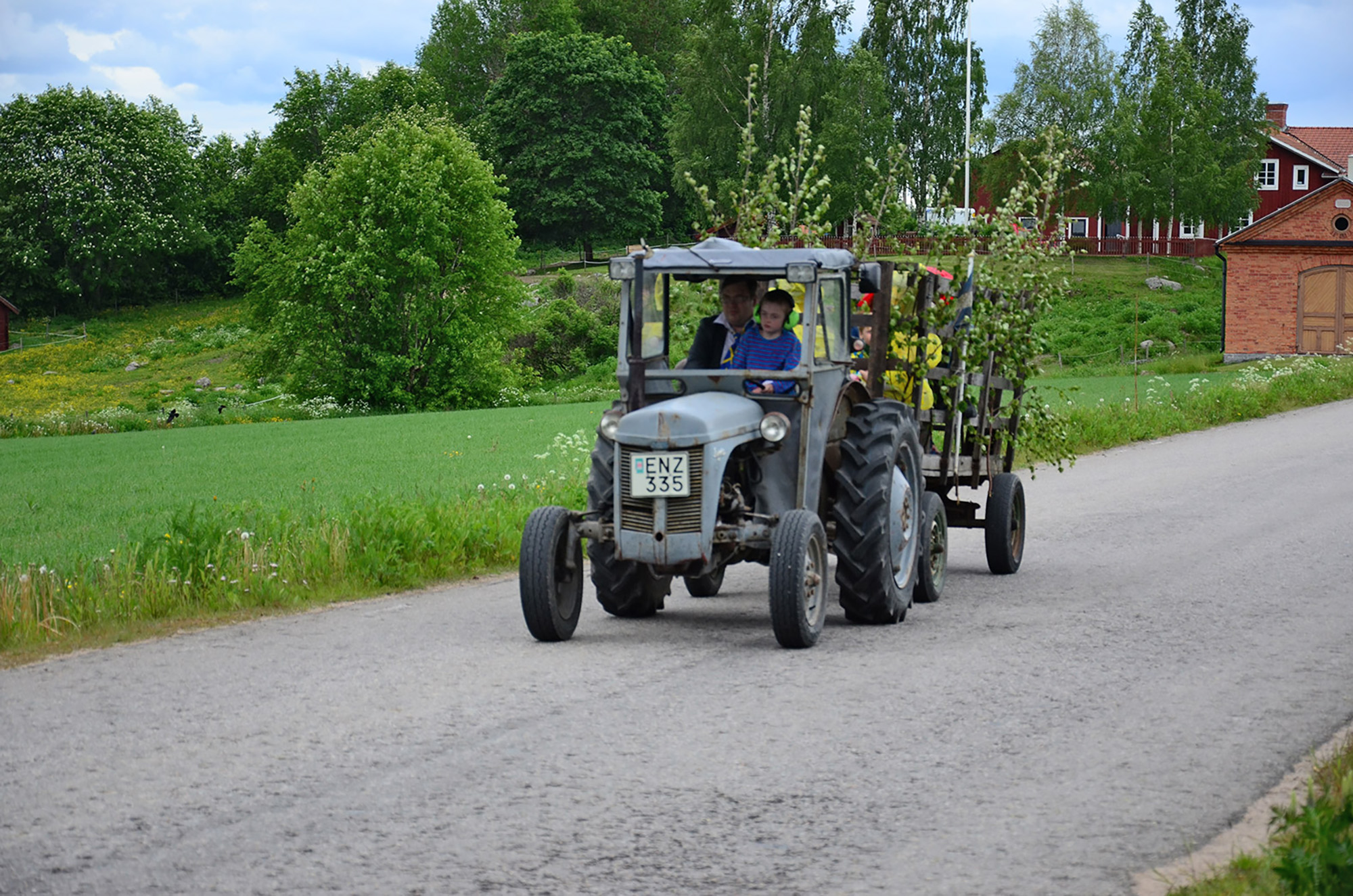 Henrik Olofsson erbjöd ett antal bekanta och grannar skjuts till midsommar-firandet i träskrinda dragen av en traktor från 1957.