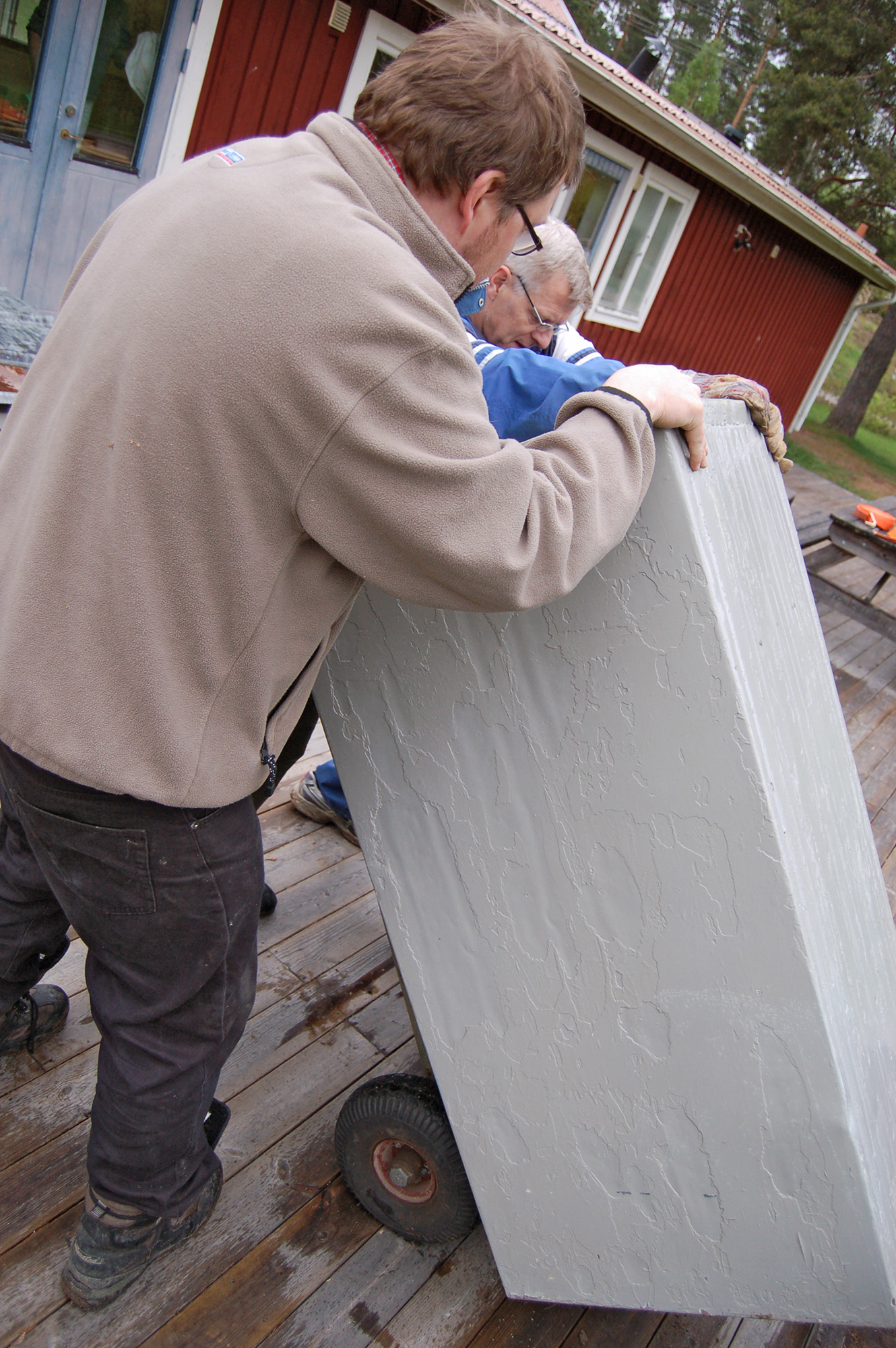 Henrik Olofsson och Stefan Sonefors baxar skåpet till altangolvet.
