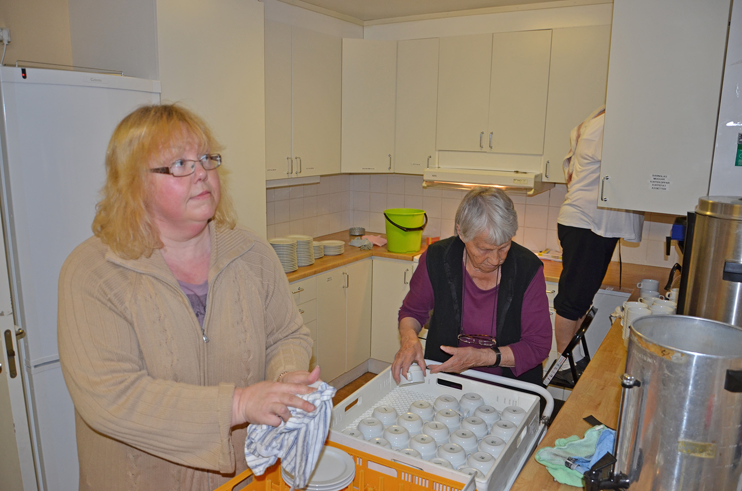 Porslinet torkas för hand sedan det lämnat diskmaskinen. Kerstin Andersson och Ellen Tällberg jobbar på.